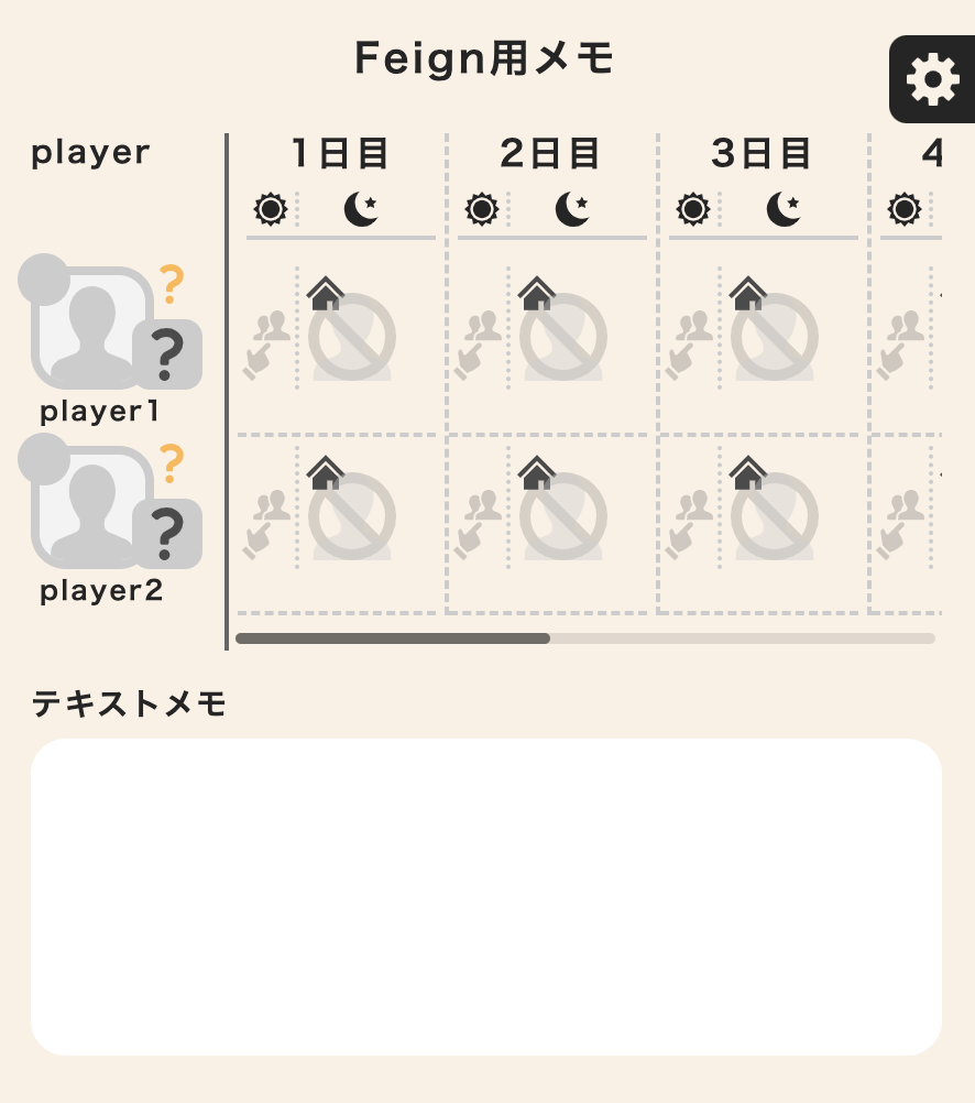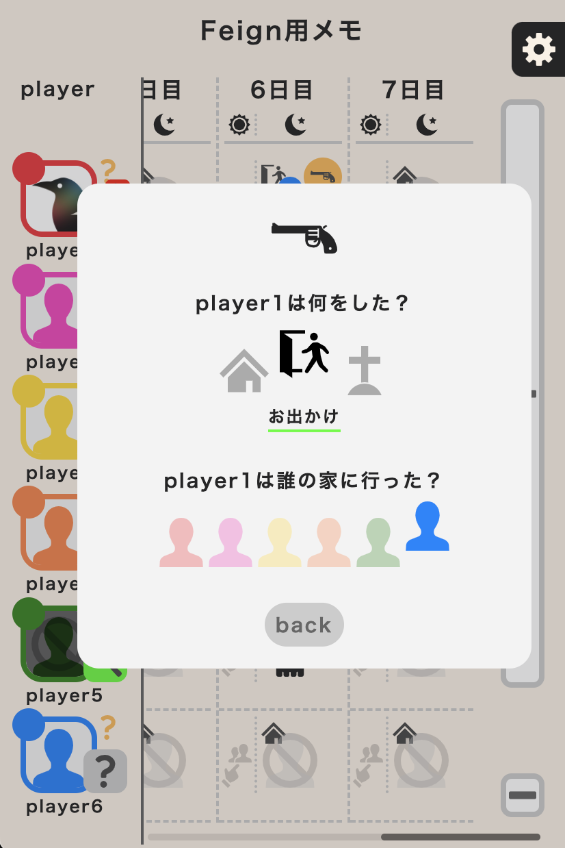 表の人型をクリックするとモーダルが開き縦軸の日付に横軸のプレイヤーが夜に何をしたのかの行動メモをつけることができます。