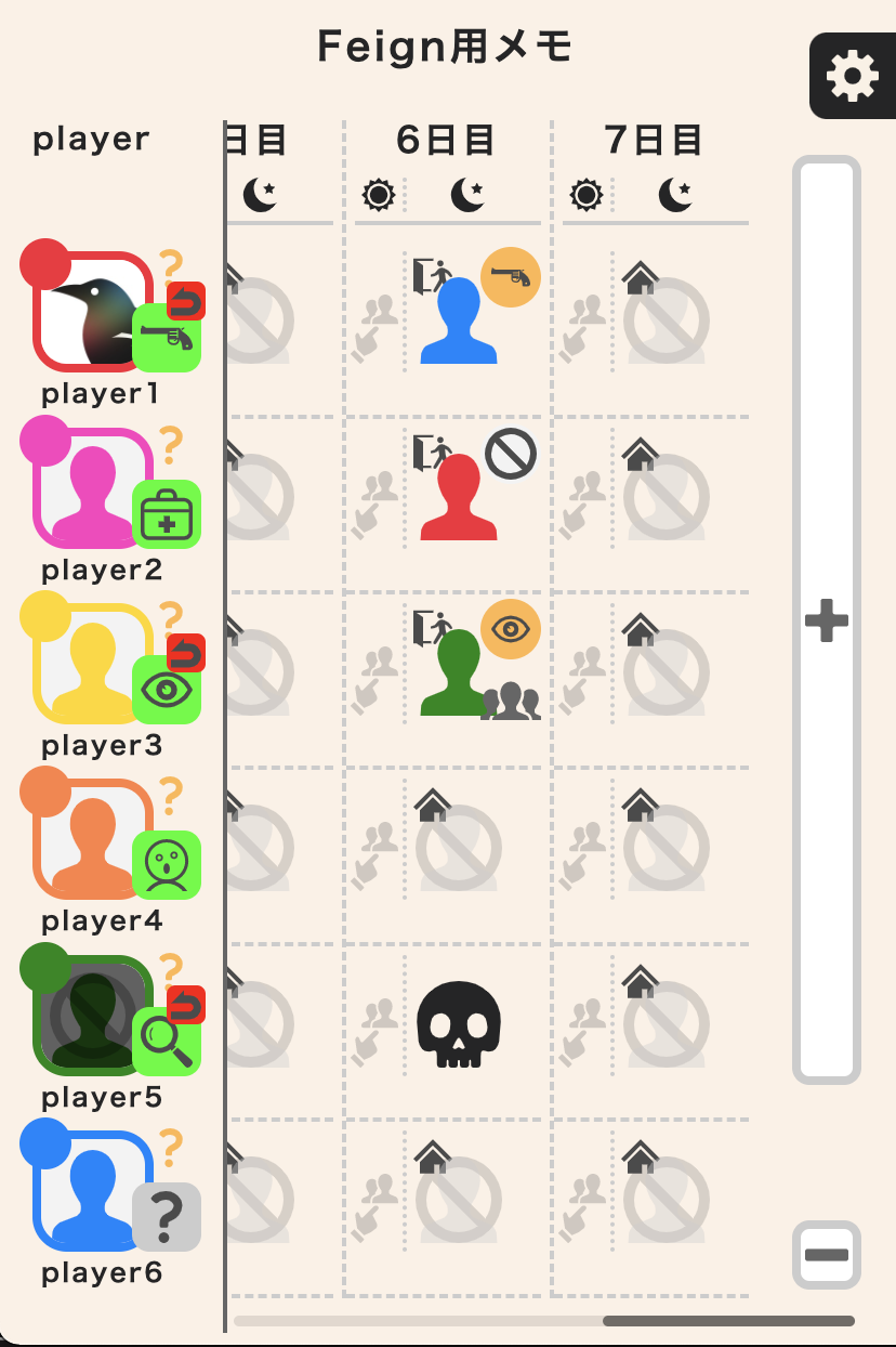 また縦軸のプレイヤーアイコンで設定した自称役職によっては表の人型アイコンの右側にアイコンが表示され、クリックすることでその役職が発動したかや細かい詳細をメモすることができます。